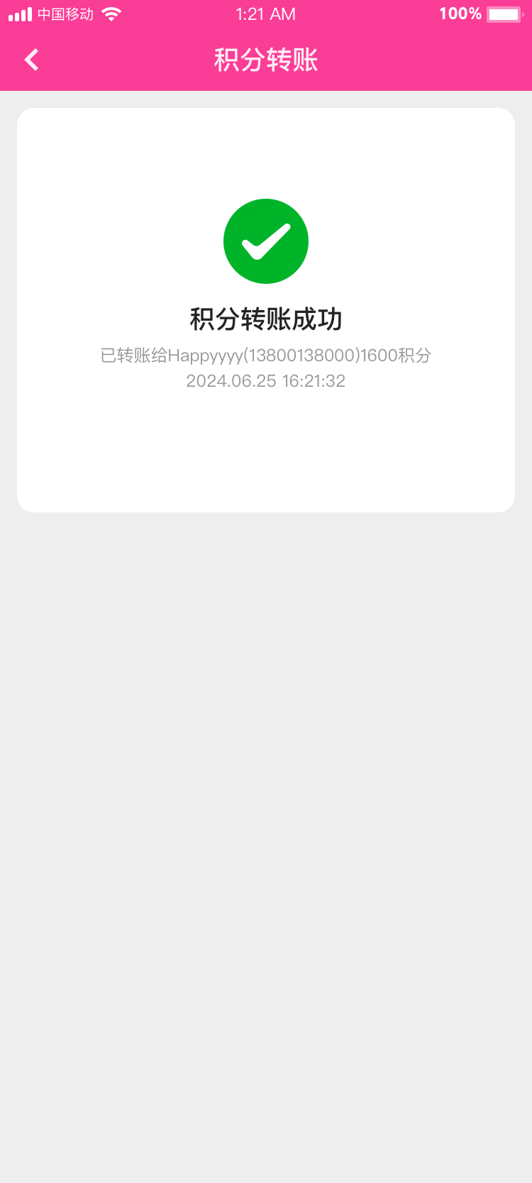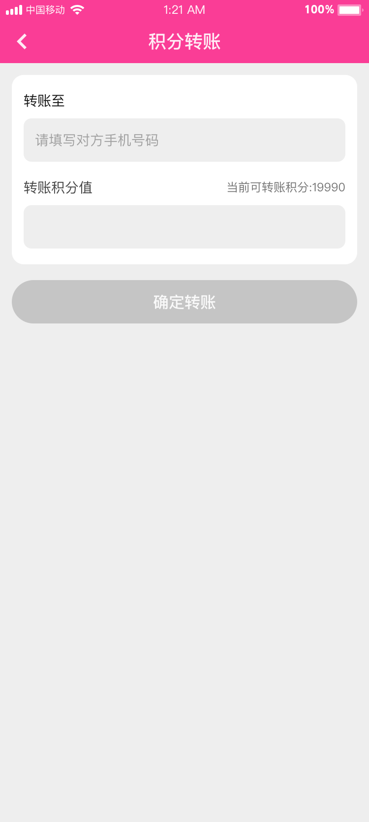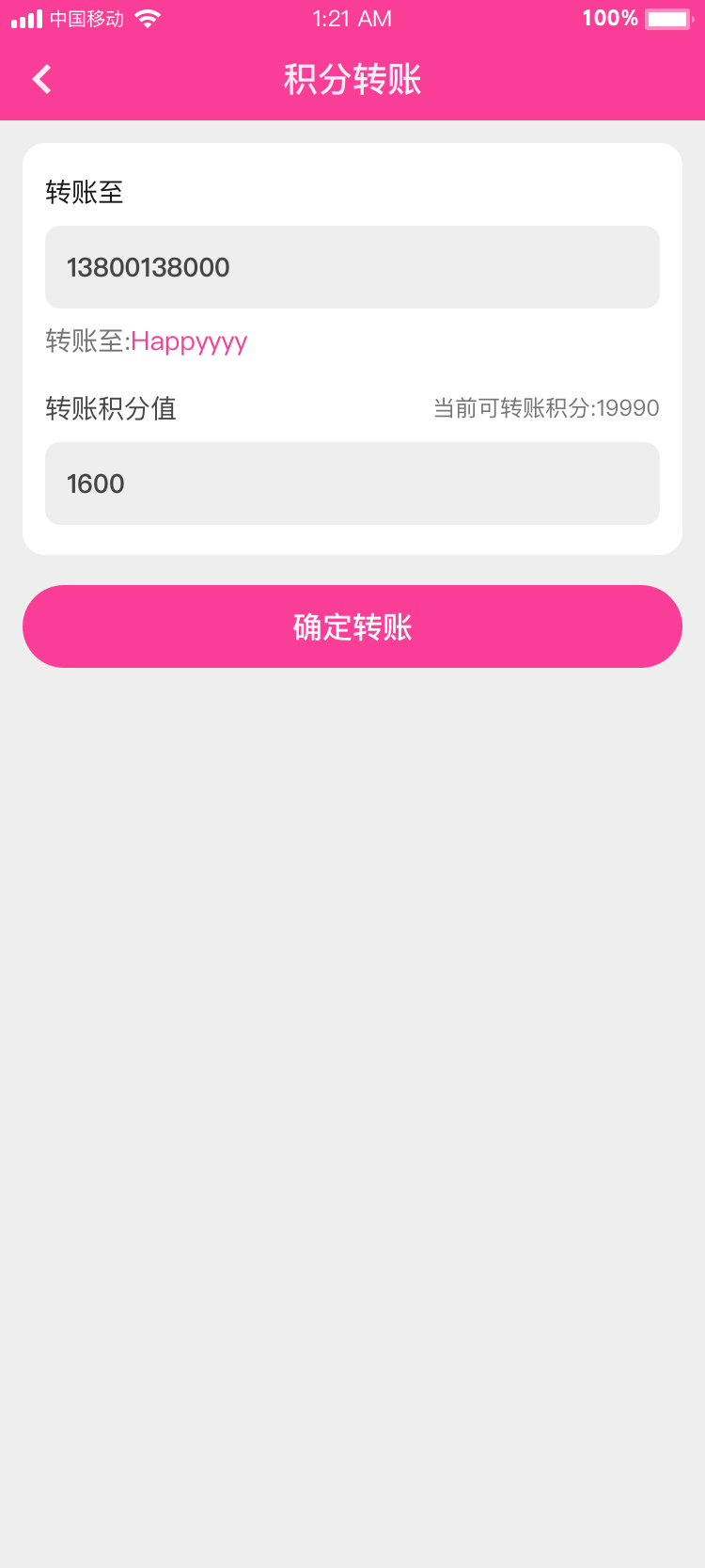 用戶可填寫轉賬目標用戶手機號,填寫轉賬積分后轉入目標用戶積分賬戶;